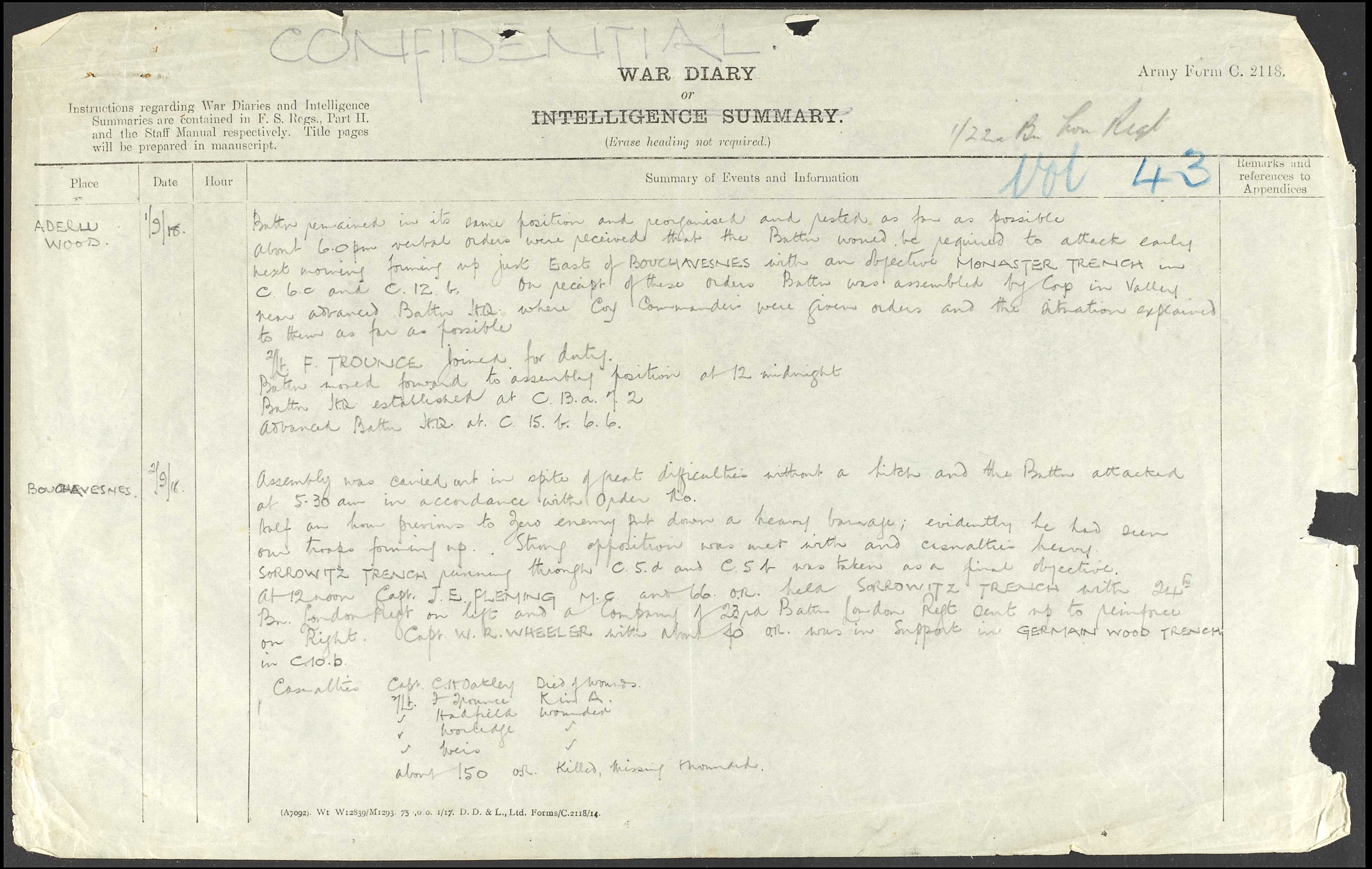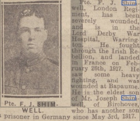 Frank was wounded in late summer 1918 near Bapaume on the Somme, which was reported in the 19th October issue of the Derbyshire Times. It would therefore seem plausible that he was wounded in September/early October. The 1/24th (County of London) Battalion (The Queen’s) were heavily engaged on the 8th – 10th September at Bouchavesnes in the Somme District and suffered numerous casualties- it is likely that Frank was wounded at this time.