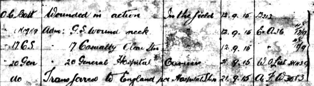 Suffered a GS wound in the neck and was admitted to the 1st NMFA, 17 CCS and 20 General Hospital before being transferred to England on 21.9.15.