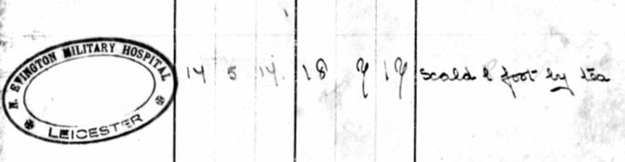 He was scalded on the right foot by tea on the 29th April 1917 and after being admitted to the 1/3 NMFA, 58 CCS and 14 General Hospital (Wimereux) he was eventually transferred to England on 17th May 1917. He received treatment in Evington Military Hospital in Leicester before being discharged from Hospital on the 18th July.