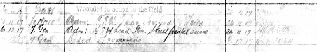 Frank received a gun shot wound in the head on 24th November that caused a severe skull fracture. He was admitted to the 1st NMFA and transferred to the 7th General Hospital where he succumbed to his wounds on the 8th December.