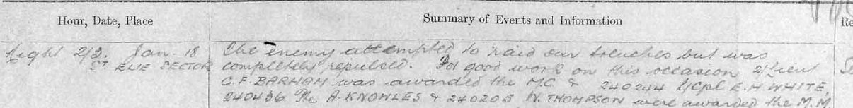 On the night of the 2nd/3rd January 1918 the Germans raided trenches at St Elie Sector but were repulsed. 2 OR were killed and 9 men wounded by enemy barrage.