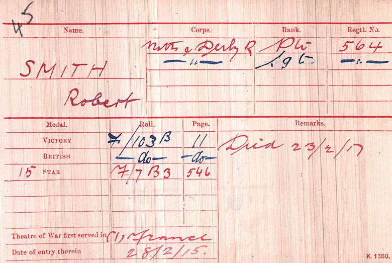 564 SmithRobert arrived in France with the 46th Division in February 1915 and is entitled to the 14-15 Star, British War and Victory Medals.