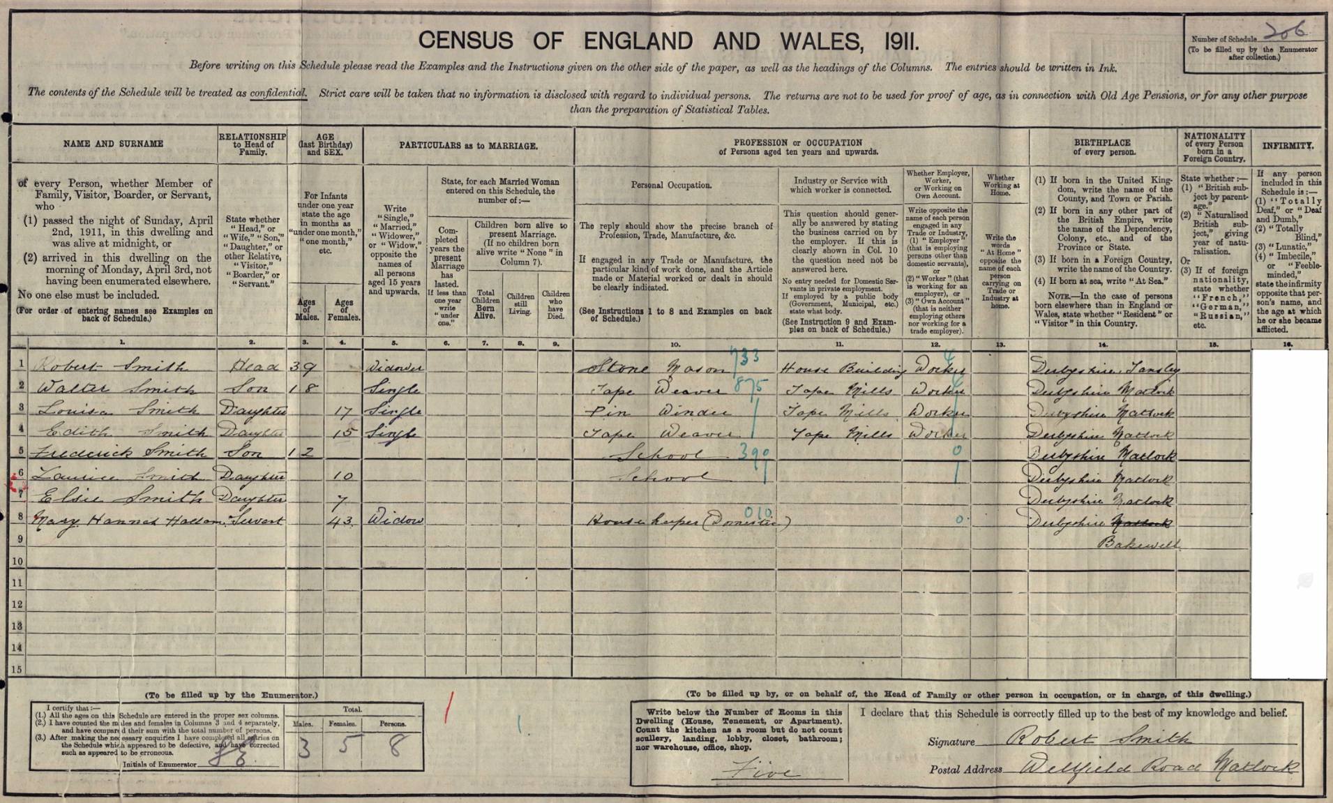 Smith CensusIn the 1911 Census Robert was living in Wellfield Road in Matlock and was a stone mason by trade. He was a widower with 6 children.