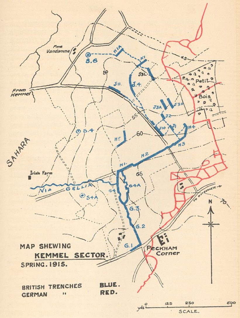 Kemmel 7.4.15: The Battalion took over G & H trenches from the 8th Battalion. The two battalions working in paris and remained in trenches four days.