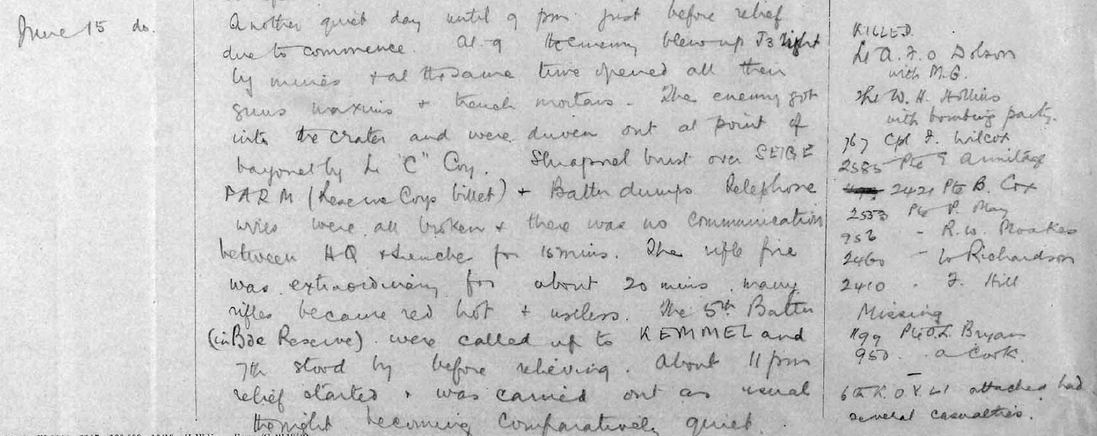 JUNE 15th. At 8.30 p.m. the Huns blew a mine up in J. 3 trench which was occupied by the 8th Battalion and the K.O.Y.L.I. There were 28 in it altogether, we had a nice set to, after our artillery bombarded them and they were sending 160lb trench mortars but did not land them far enough.