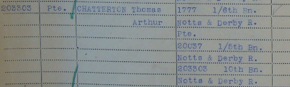 Thomas enlisted in Whaley Bridge in January 1913 and served with “H” Company. He was the Son of Mr Moratio Chatterton of Thornsett and was employed at Waterside Paper Mill. He attended Thornsett Independent Chapel.