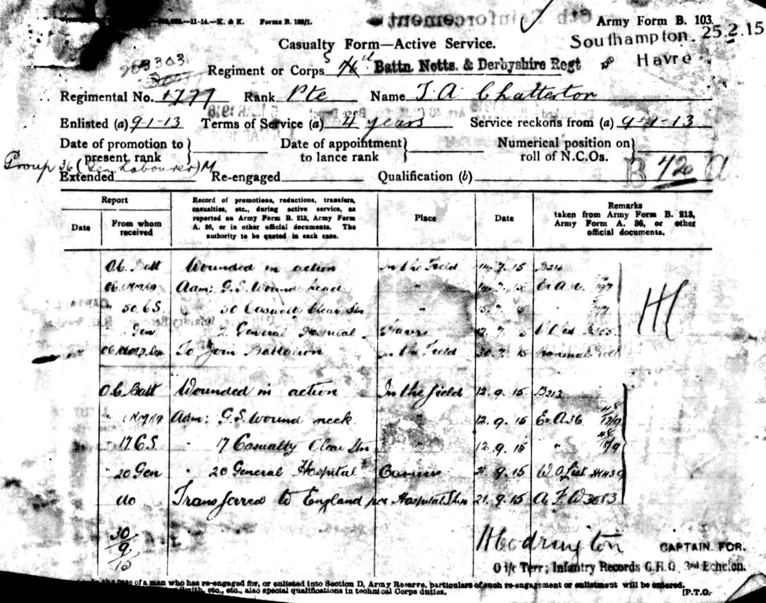 1777 Pte Thomas Arthur Chatterton, a labourer from 35 Barn End Cottages in Thornset near to New Mills, suffered GS wound in the head and was admitted to 1st NMFA then transferred to the 50 CCS and 2 General Hospital. He re-joined the 1/6th Battalion on 30th July 1915.