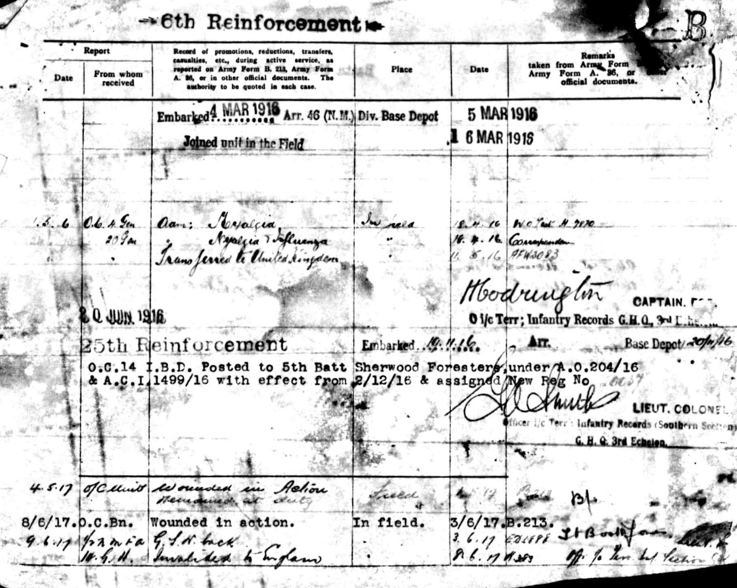 Page 2 of his Army Service Recording that Thomas returned to the 1/6th Battalion in France with the 6th Reinforcement on the 4th March 1916. However, he again returned to England on the 11th May 1916 suffering from mayagia (muscle pain) and influenza.