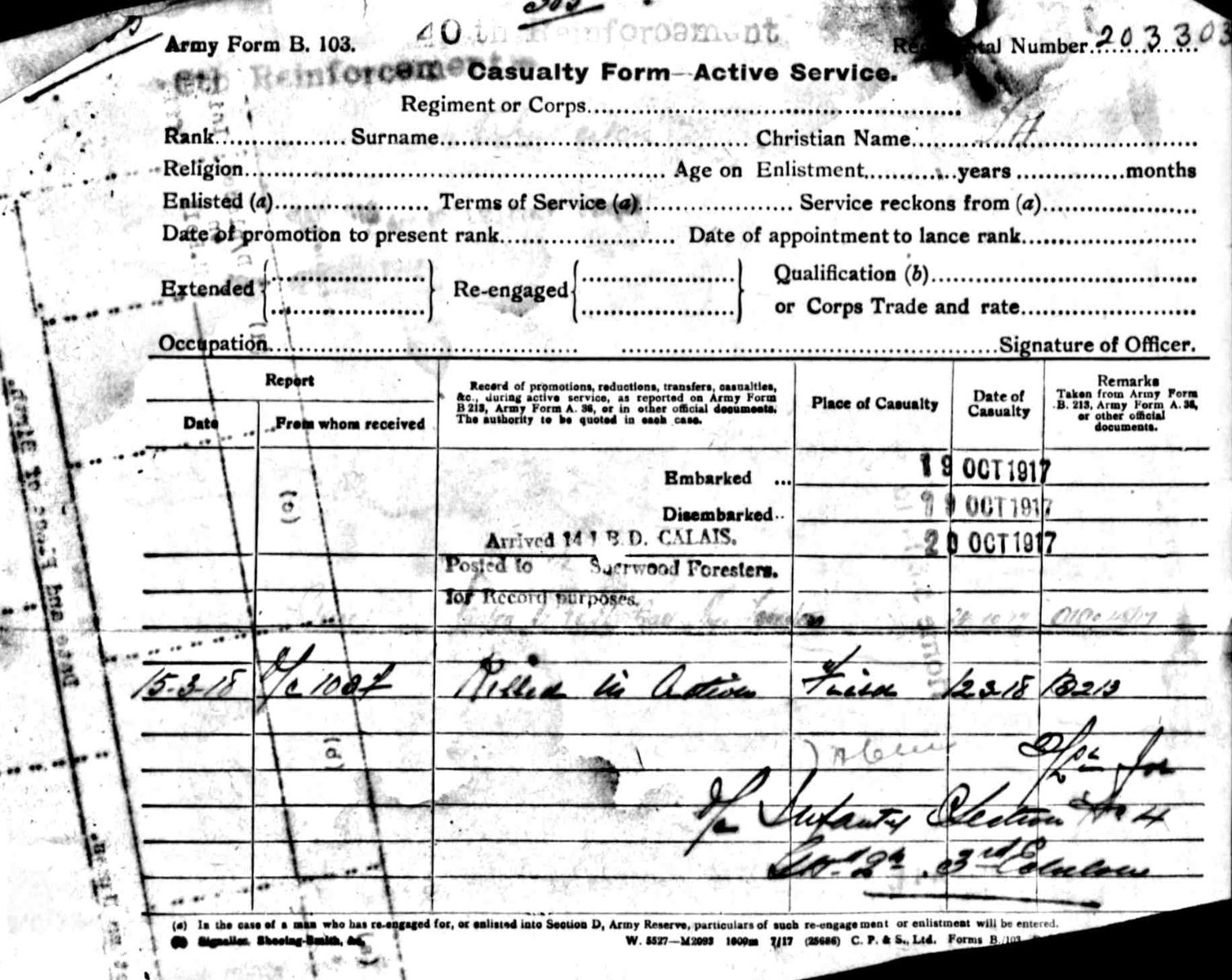 However, Thomas returned to France with the 40th Reinforcement on the 19th October 1917 and posted to the 14th Infantry Base Depot in Calais. He was transferred to the 10th Battalion on the 24th October 1917 and killed in action on the 15th March 1918.
