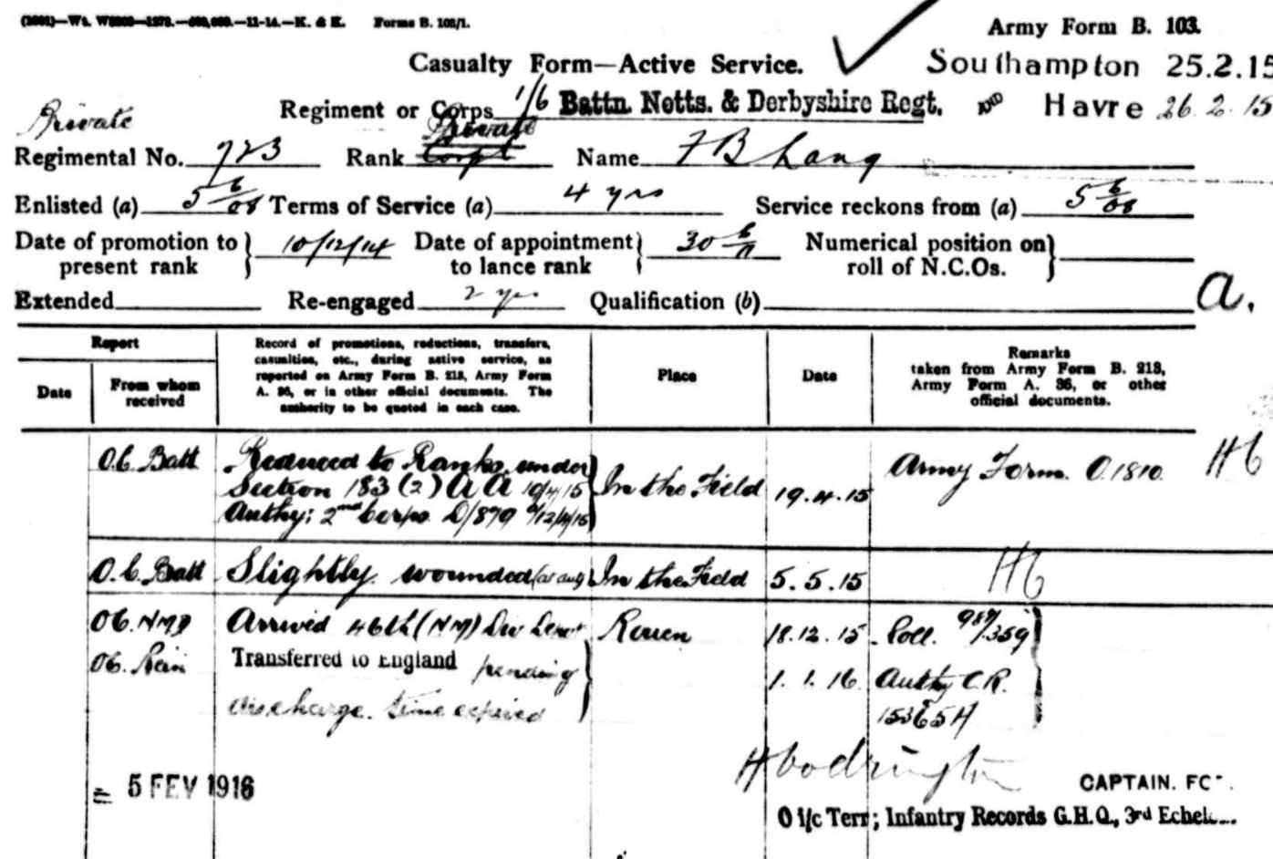 Francis Bernard Lang a 30 year old coal miner from Staveley was transferred to England on this day as “Time Expired”. Francis has originally enlisted into the 6th Battalion in June 1908 and served with “A” Company.