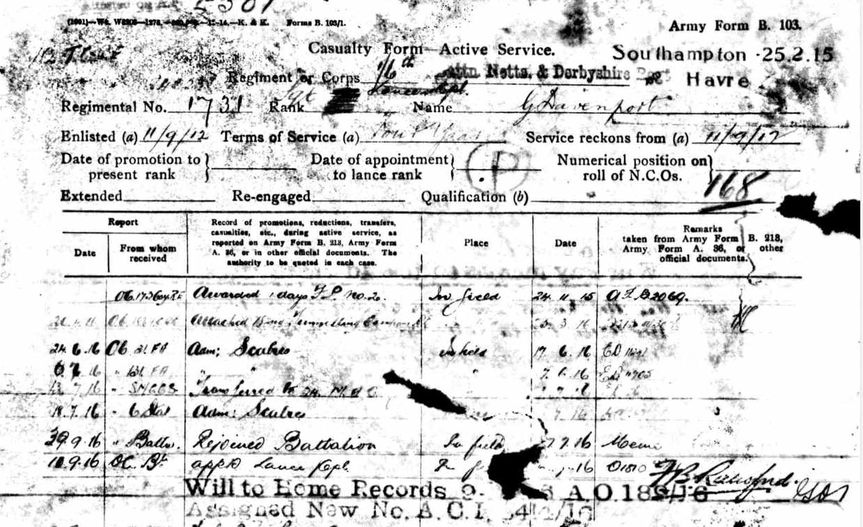 1731 Pte George Davenport, a horse driver from Peak Forest and a Pre-War Territorial serving in “B” Company was admitted to Hospital with scabies. He rejoined the Battalion on the 7th July.