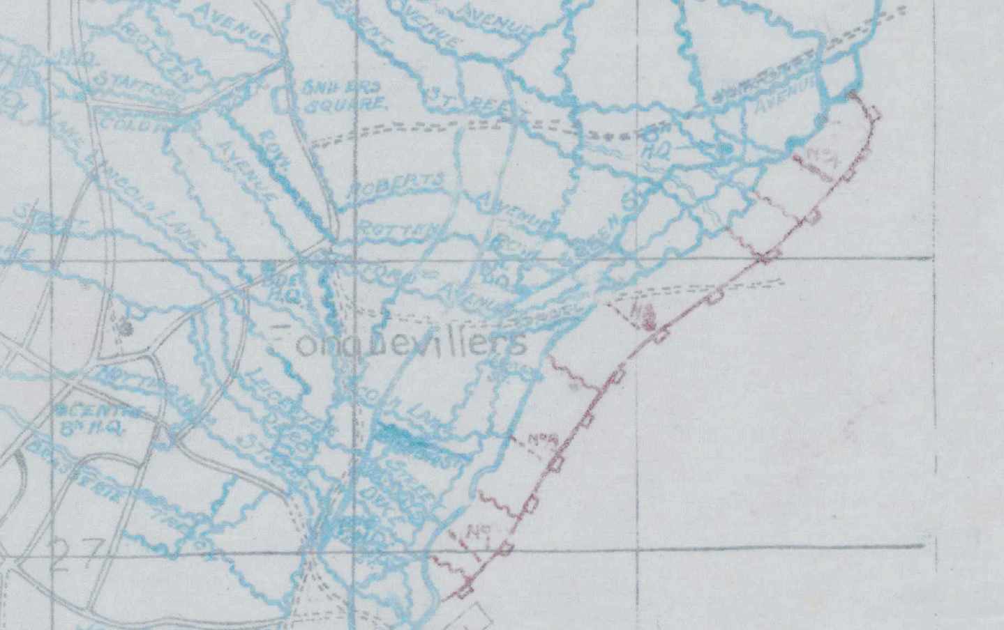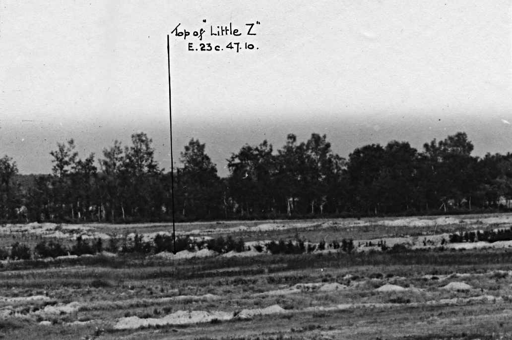 25: This is “V” day. Wire cutting continued by T Mortars & 18 Pdrs, unfortunately the 2″ trench mortar was knocked out. This mortar was cutting wire in the vicinity of LITTLE Z. Progress in wire cutting is being made on the right front, but on the left front it is not satisfactory. The weather has broken down again & the trenches are becoming worse.Little z 1916
