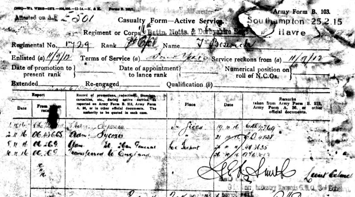Tom Beswick, a stone quarryman from Peak Dale and a pre-War Territorial in “B” Company  was admitted to the North Midland Field Ambulance, 43rd Casualty Clearing Station and 2nd Canadian General Hosptial suffering from sycosis (inflammation of hair follicles). He was later transferred to England for treatment. Tom returned to France with the 33rd Reinforcement in April 1917.