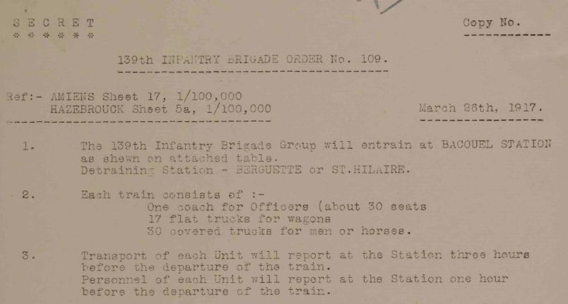 On this day 28th March 1917 Leave a reply 28.3.1917 BACOUL: The Battalion entrained at 3am. 28.3.1917 BERGUETTE: The Battalion detrained at 9.30pm and marched into billets at LIGNY LES AIRE. 1/6th Battalion War Diary [WO/95/2694] 139 Infantry Brigade: Headquarters War Diary [WO95/2692] Share this: Click to share on Facebook (Opens in new window) Facebook More Click to share on X (Opens in new window) X Like Loading... Related