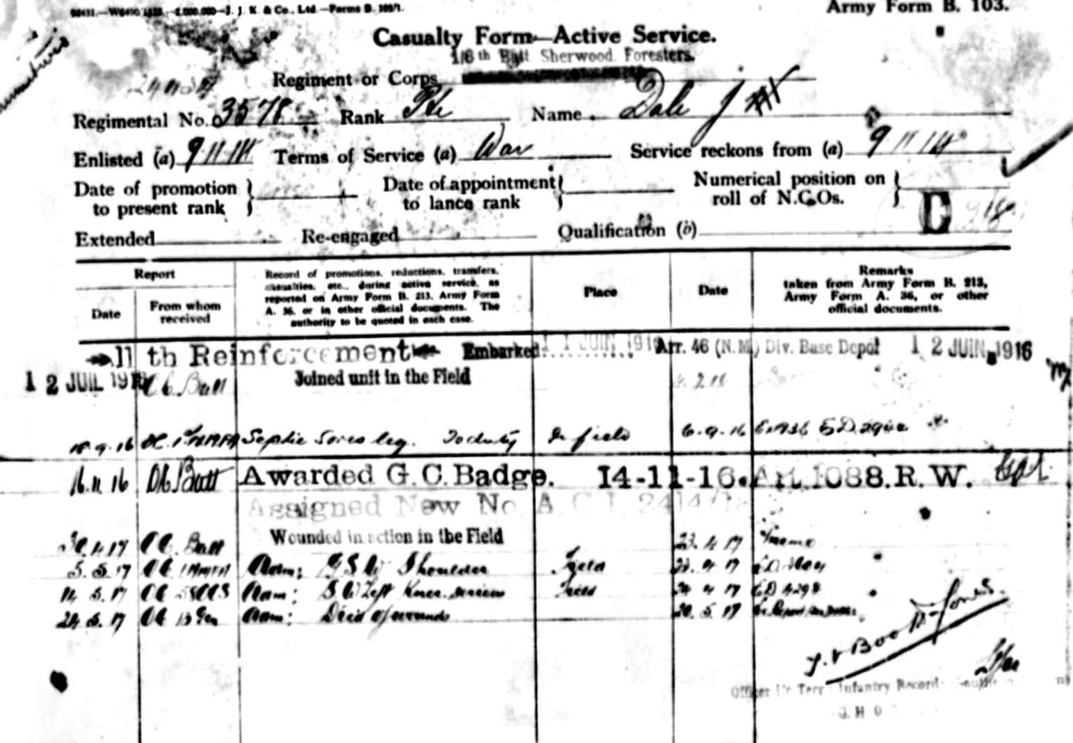 3578/241134 Pte Joseph Dale a brick maker from Matlock died of a gun shot wound received on the 23rd April during the attack on FOSSE 3 DE LIEVIN.