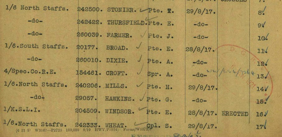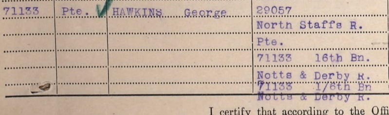 Although the Commonwealth War Graves Commision and Soldiers Died in the Great War record George as serving with the 1/6th Sherwood Foresters, it seems more likely that he was serving with the 1/6th North Staffordshire Regiment, which suffered a number of casualties on that day as recorded on the Grave Registration Report (which includes Hawkins recorded as 1/6 North Staffs).