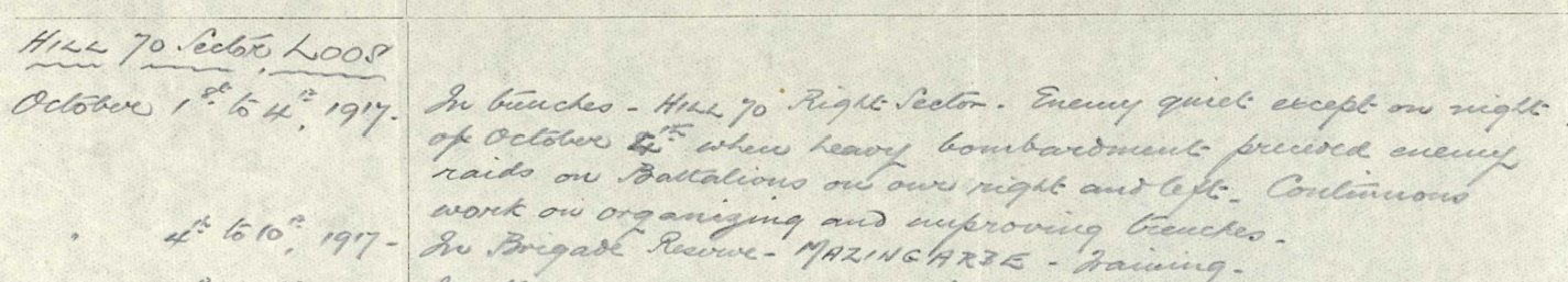 At the time of his wounding the 1/5th Battalion were occupying the front line trenches in the HILL 70 Right Sub Sector. Harry was one of 5 men killed that month.