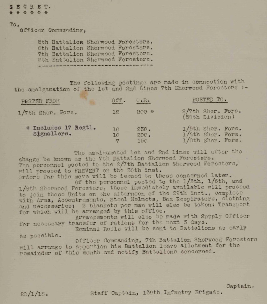 26/1/1918: Orders have been received to the effect that 1/7th Sherwood Foresters will be amalgamated with the 2/7th Sherwood Foresters.