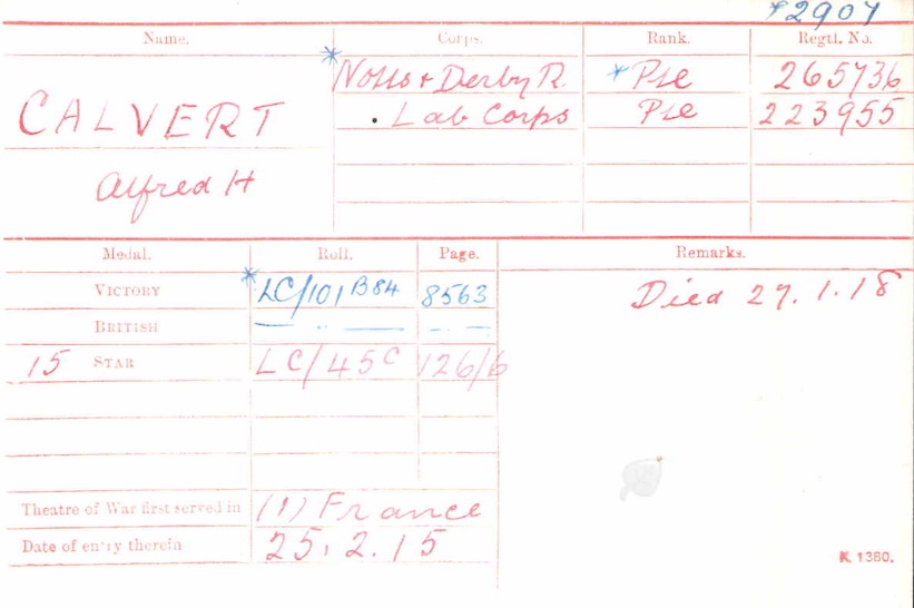 Alfred was an original member of the 1st Nottinghamshire (Robin Hood) Rifle Volunteer Corps and enlisted into the 7th (Robin Hood) Battalion Sherwood Foresters in April 1908 (#425) and subsequently re-enlisting in 1914 (#2907). He arrived in France with the North Midland Division in February 1915 and was still serving with the 7th Battalion at the time of the Territorial Force renumbering in Spring 1917 (#265736). At some point he transferred to the 250th Employment Company of the Labour Corps (#223955).
