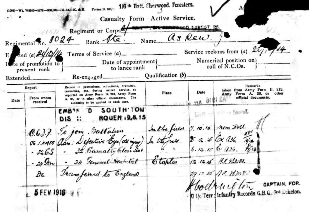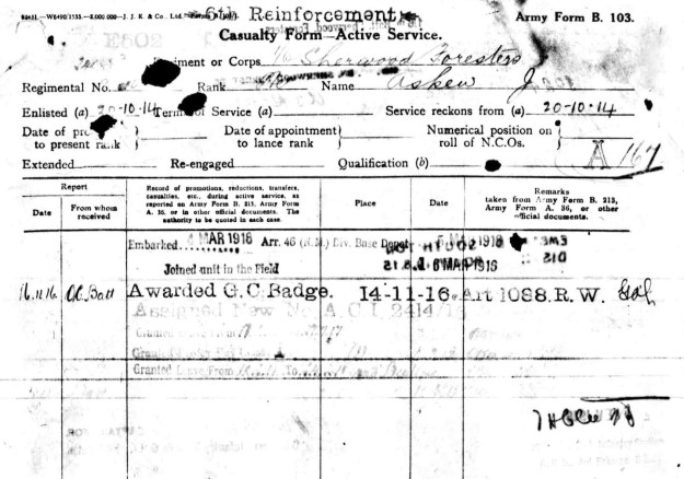 Joseph Askew was a 32 year old labourer from Eckington who enlisted into the 2/6th Battalion in October 1914. He was transferred to the 1/6th Battalion in August 1915 and arrived in France with the III Reinforcement. He injured his eye and returned to hospital in England in December 1915. Joined the 6th Reinforcement in March 1916 in time for the Battle of the Somme.