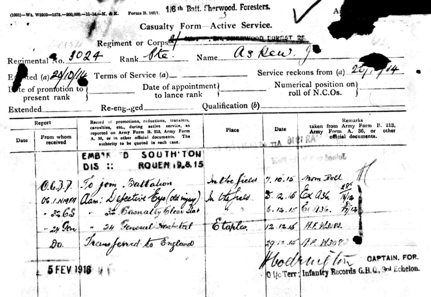 Joseph Askew was a 32 year old labourer from Eckington who enlisted into the 2/6th Battalion in October 1914. He was transferred to the 1/6th Battalion in August 1915 and arrived in France with the III Reinforcement. He injured his eye and returned to hospital in England in December 1915. Joined the 6th Reinforcement in March 1916 in time for the Battle of the Somme.