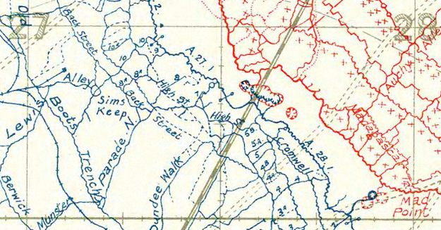17th March: The enemy cut two gaps in our wire at A.28.c.1.6 and A.27.d.70.05 with his artillery. There was a good deal of activity with 105 mm shells on Reserve Line and Trench Junctions.