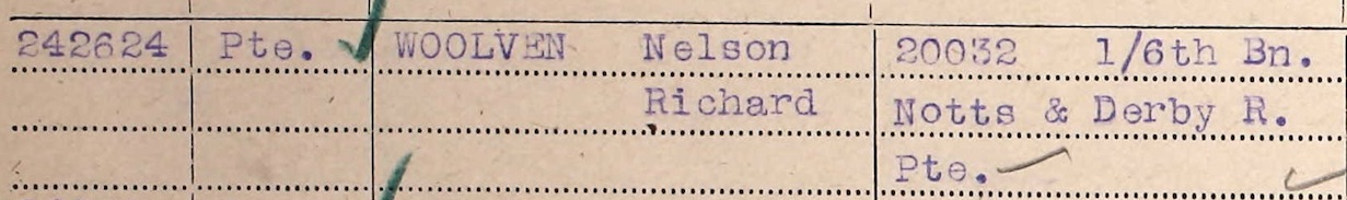 242624 Pte Nelson Richard Woolven aged 25. Son of George and Sarah Ann Woolven from Horsham. Likely joined the 1/6th Battalion as part of the 26th Reinforcement in December 1916.