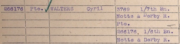 3769/266176 Pte Arthur Cyril Walters aged 21. Son of Richard and Charlotte Walters, of Cemetery Lodge, Wilford Hill, late of New Lenton, Nottingham. Enlisted and served in 1st/7th Notts and Derby (Robin Hoods) from Feb 1915 until Feb 1918. See here.