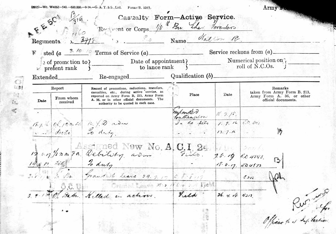 “It is with great regret that I have to inform you that a serious accident happened this afternoon to your son. He was asleep with Pte. R Watson, a friend of his in a shelter in our trench, when a shell exploded close to them, and they must have died at once, without knowing anything about it. It has been a great loss, not only to the Platoon, but to the entire company, and to every one of us, it was a terrible grief when what had happened. I went up at once to find out if anyone had been seriously hurt, as I saw the shell come, and then the stretcher bearers. I saw it was fatal when I got there.”