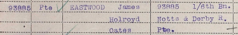 93885 Pte James Holroyd Oates Eastwood from Halifax. Posted to the Sherwood Foresters (2/5th Battalion?) approx July 1917 before transferring to the 1/6th Battalion in France (approx February 1918).