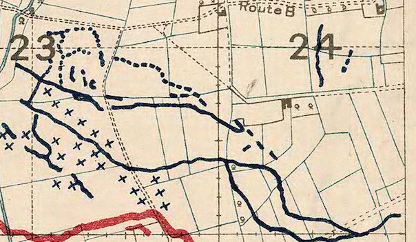 5.6.18: X13 a & b was fairly heavily bombarded with Blue Cross Gas – otherwise hostile artillery was quite. Priester bombs were fired into left subsection. Six patrols were out during the night. From these reports it appeared evident that the enemy had given up his outpost line and withdrawn to a position covering house and orchard at X.24.c.4.7.