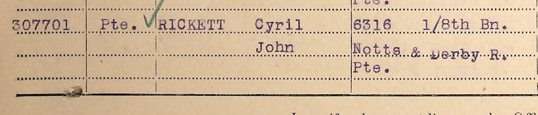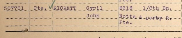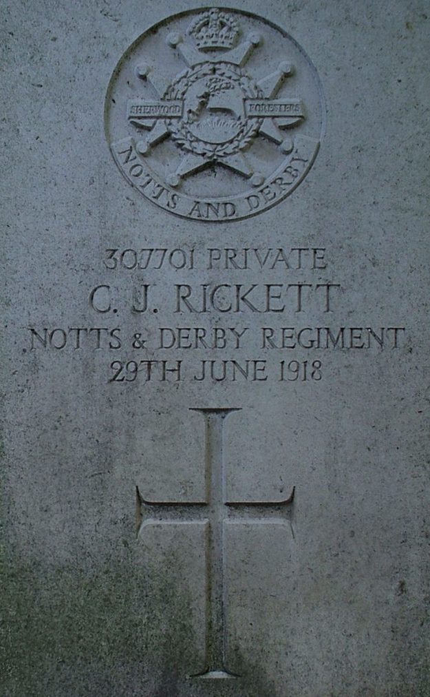 Cyril John Rickett died of his wounds at home in Nottingham aged 19. Married to Millicent Gertrude Rickett of West Bridgford.