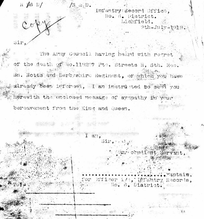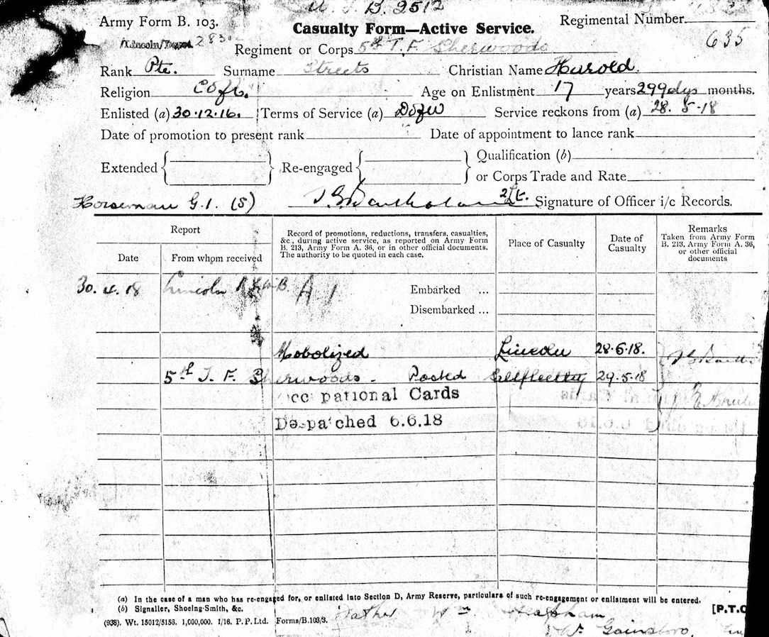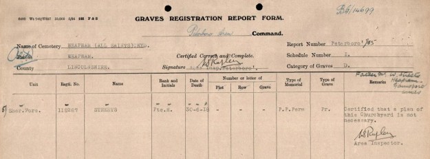 Harold Streets of the 5th Reserve Battalion died of sickness in Hospital near Salfleet aged 19. Had only been mobilised in May 1918. Buried Heapham Lincs.