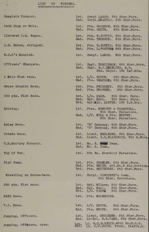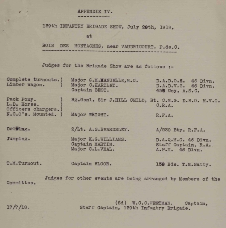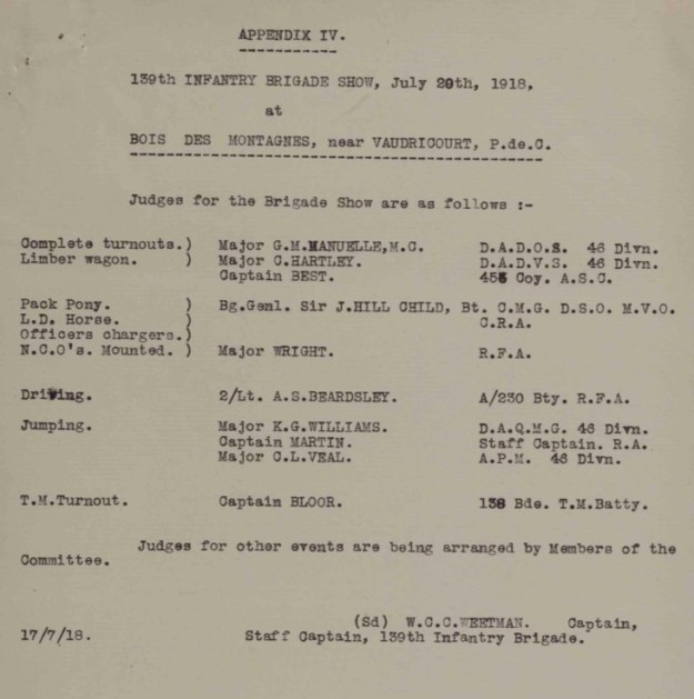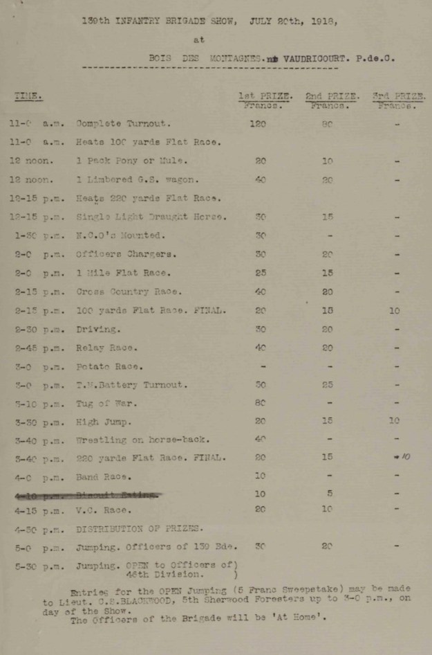139th Infantry Brigade Show on 20th July 1918 Leave a reply Amidst the carnage of the Western Front the 139th Infantry Brigade held a horse show and sports day. The various competitions and prize money The Judges The Winners Share this: Click to share on Facebook (Opens in new window) Facebook More Click to share on X (Opens in new window) X Like Loading... Related