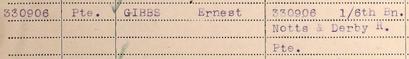330906 Pte Ernest Gibbs was the son of Mr and Mrs Robert Gibbs of Derby. He had previously served with the 21st Battalion before joining the 1/6th Battalion in France.