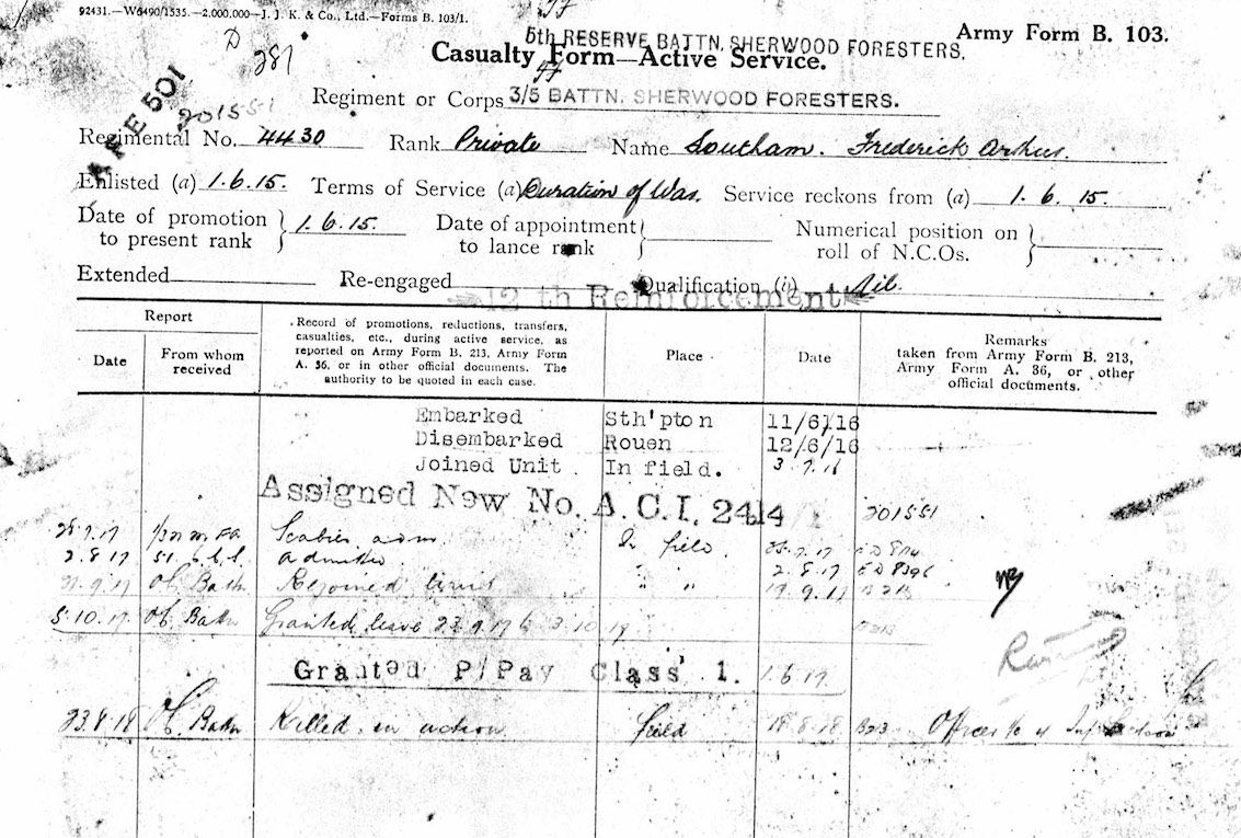 4430/201551 Pte Frank Arthur Southam from Ashby-de-la-Zouch. Arrived in France in 1916 and only served overseas with the 1/5th Battalion.