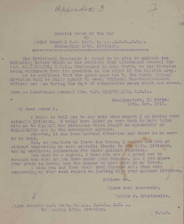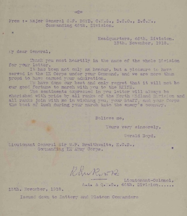 On this day 14th November 1918: 46 NMD joined XIII Corps Leave a reply 14/11/18: Battn moved to billets in LANDRECIES. 46 Division left IX Corps and joined XIII Corps. Division not detailed to from part of Army of Occupation. 1/6th Battalion War Diary [WO/95/2694] Share this: Click to share on Facebook (Opens in new window) Facebook More Click to share on X (Opens in new window) X Like Loading... Related