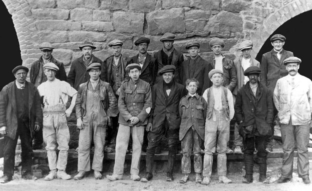 A group of quarrymen at Holderness Quarry, Dove Holes. Some are wearing discarded army tunics, which dates this photograph to post–1918.