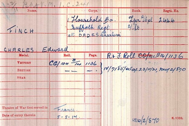 This is possibly Charles Edward Finch who joined the 6th Battalion on the 28th November 1918 and therefore would not appear on the Sherwood Foresters Medal Roll.