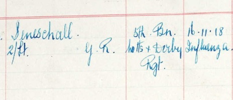 121031 Pte Frank Edward Bennett a coal miner from Pleasley Hill. who was mobilised and posted to the 5th Res Battn on the 8th August 1918. He was admitted to Hospital on the 11th November and died at Grimsby Military Hospital 5 days later.