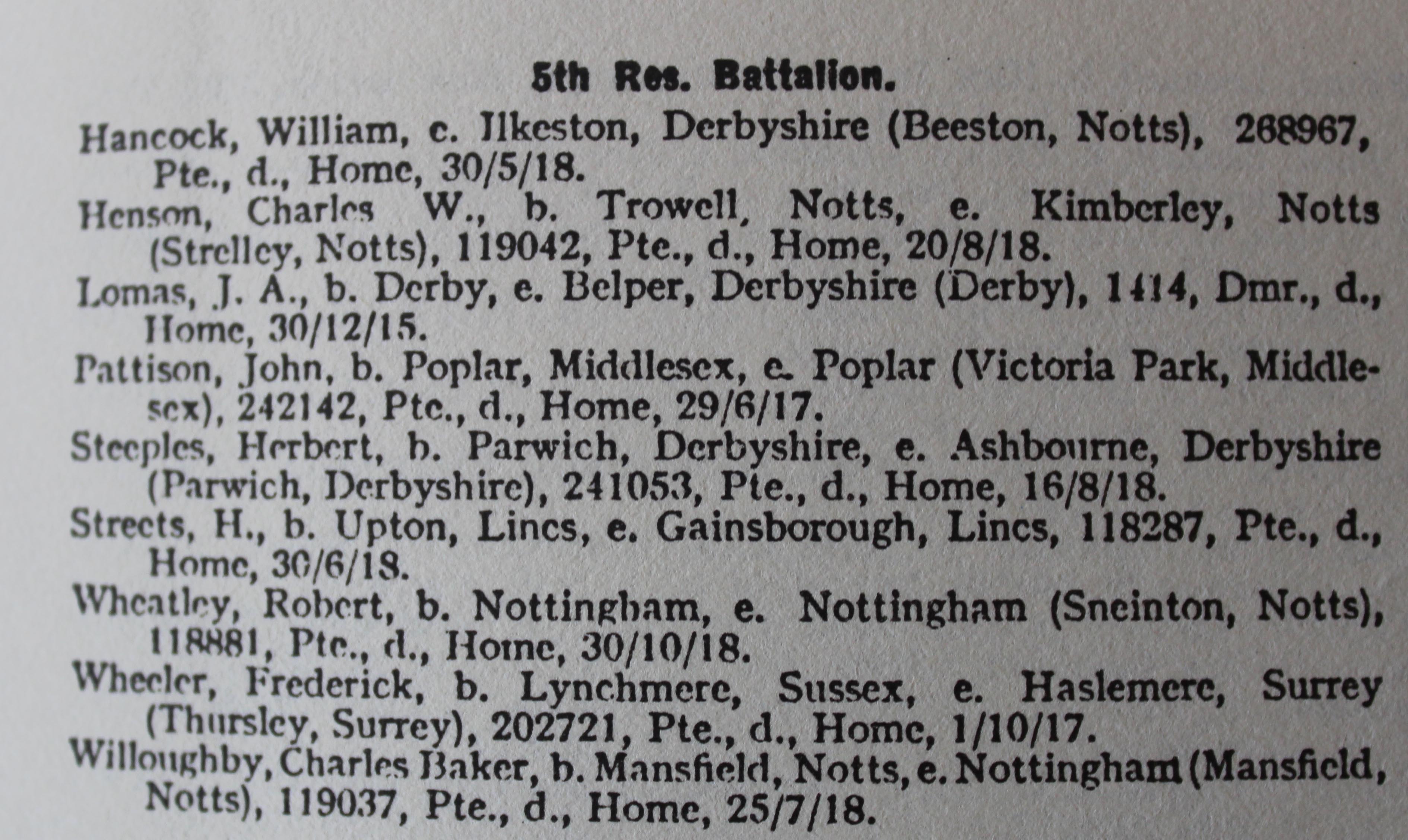 On the 1st September 1916 the 5th Reserve Battalion Notts & Derby Regiment was formed through the amalgamation of the 3/5th and 3/6th.