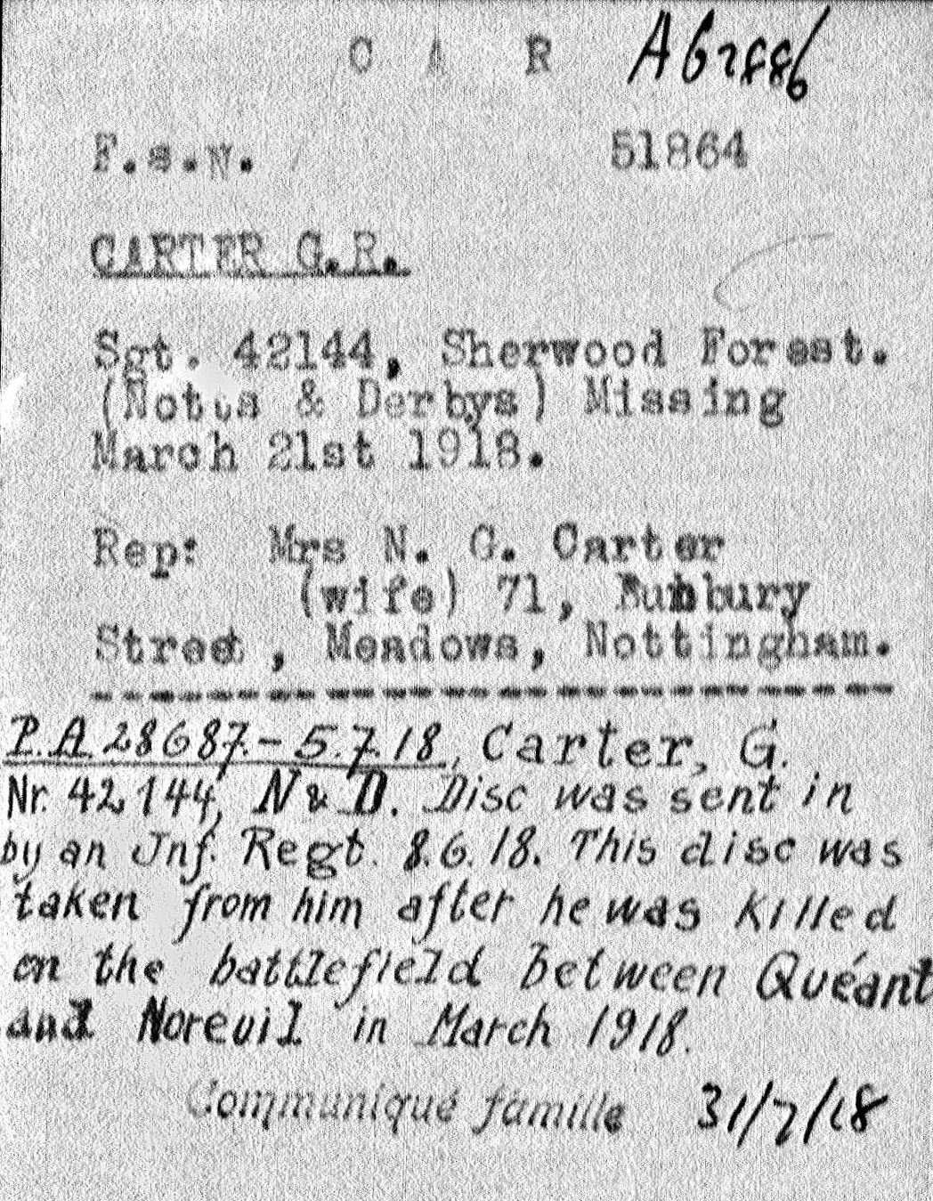 In the Summer of 1918 Nellie Carter submitted a request to the Red Cross (presumably via the War Office) if there was any information on her missing husband. She was later to hear the terrible news that George had been killed on the 21st March 1918.