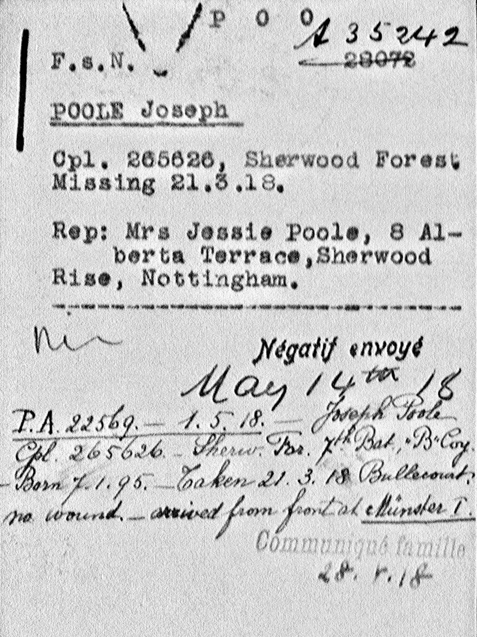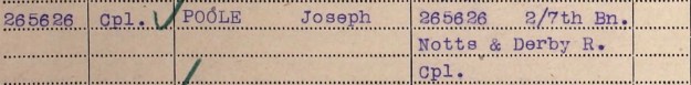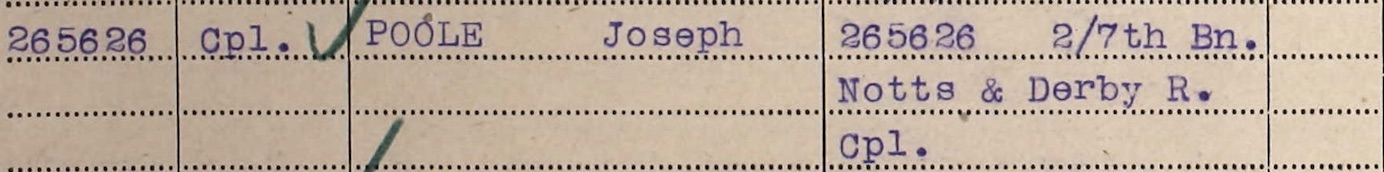 265626 Pte Joseph Cole served with “B” Company the 2/7th Battalion Sherwood Foresters during WW1and was in the front line trenches on 21st March 1918 at the start of the German Spring Offensive.