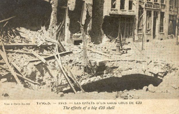 “On the Saturday night we went up to the lines on fatigue, and travelled up a long way in motor lorries; it was quite an exciting journey for us after we left the lorries to march through Ypres, especially as for many of us it was the first experience of the war. Fritz was sending over a few gas shells and we were all sneezing and rubbing our eyes. We drew spades and set off after a short rest, landed at the work, finished off fairly quickly and started for home – home consisting of bivvies made from water-proof sheets, and some of us hadn’t even got those. We had a pretty rough journey coming through Ypres, had just downed tools and started the march towards the houses, when Fritz began shelling; of course he managed to get a lucky shot right in the middle of us, killing and wounding about half the party, many of whom had not yet even seen the trenches”.