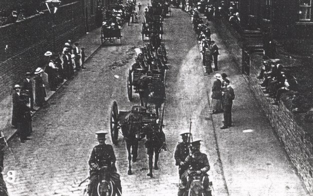 “The crowds who cheered were also permitted a smile and a joke at our transport. Little wonder, for its variegated collection. The furniture-remover’s van, the brewer’s dray, and the grocer’s cart, even the farmers waggon, found their place in the column.”