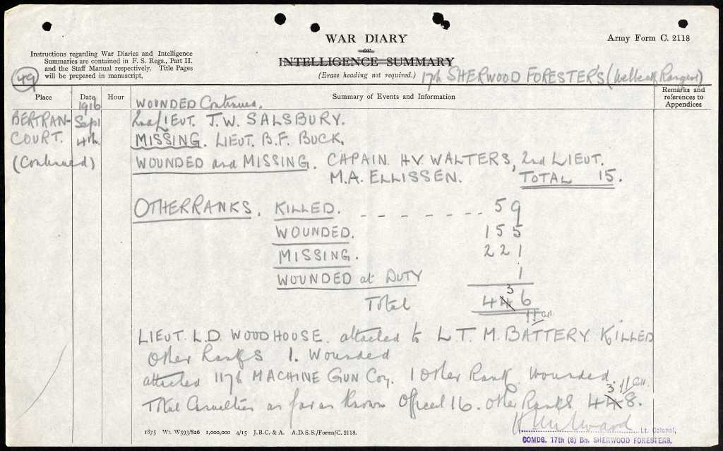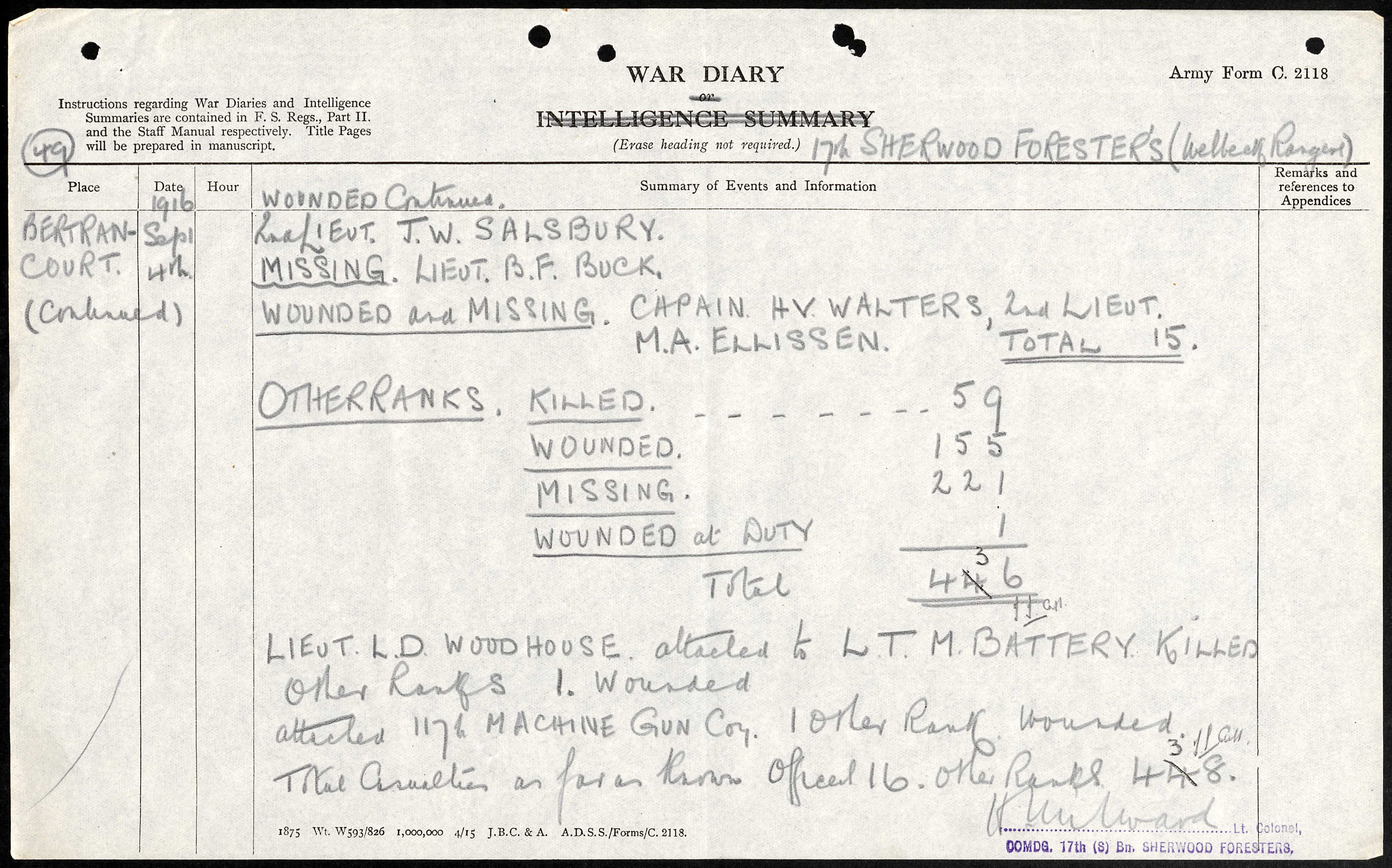 Following training with the 6th Reserve Battalion James was transferred to the 1/6th Battalion and proceeded overseas to the 8th Entrenching Battalion in France. James was later posted to the 17th Battalion (The Wellbeck Rangers) on the 9th September 1916 with approximately 100 other men who were all renumbered from 70211 to 70312. This reinforcement was to make up for losses suffered by the 17th Battalion during their attack on Beaumont Hamel.