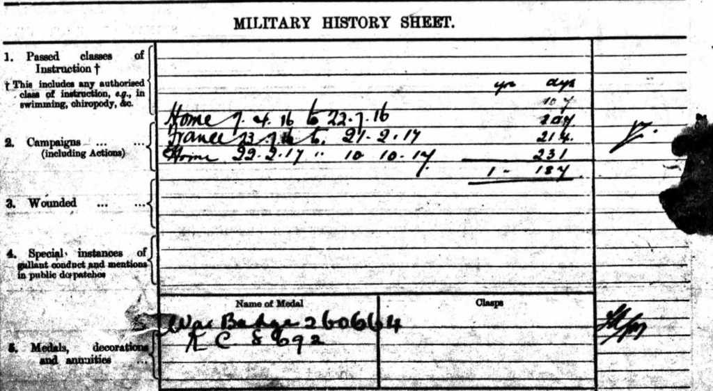 James served in France with the 17th Battalion until he was posted home on the 22nd February 1917 suffering from rheumatism. After time spent at the Command Depot (possibly at Ballyvonare, County Cork) he was posted to the 3rd Battalion and then discharged in October 1917.