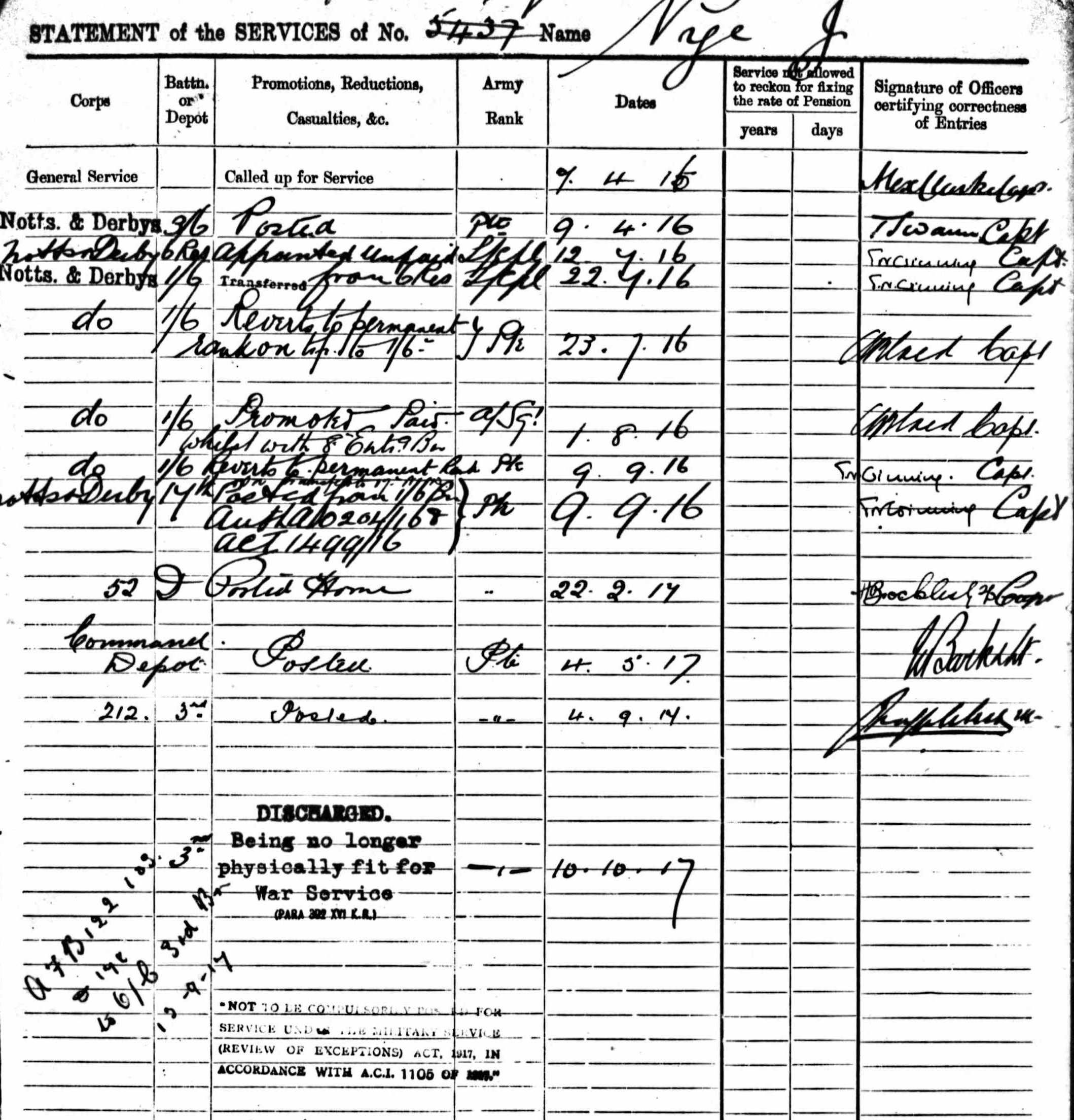 James Nye enlisted into the 3/6th Sherwoods Foresters at Chesterfield in April 1916. James was a 36 year old farm labourer from Arlington near Guildford. His enrolment was approved by Captain Swann.
