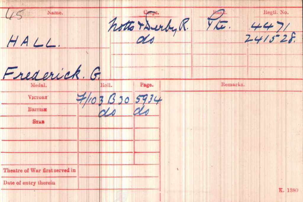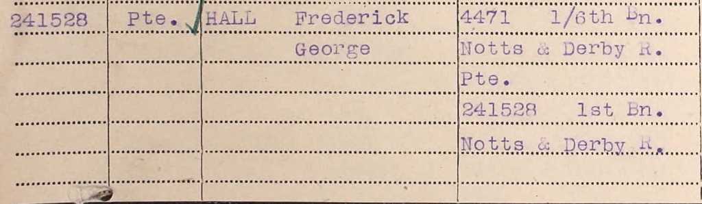 Frederick enlisted into the 3/6th (or 2/6th) Battalion in August 1915 and was subsequently posted to the 1/6th Battalion. He was not awarded a 14-15 Star so probably arrived in France in 1916. He was still serving with the 1/6th Battalion at the time of the Territorial Force renumbering in spring 1917. At some time (and for reasons unknown) he was transferred to the 1st Battalion. He survived the War.