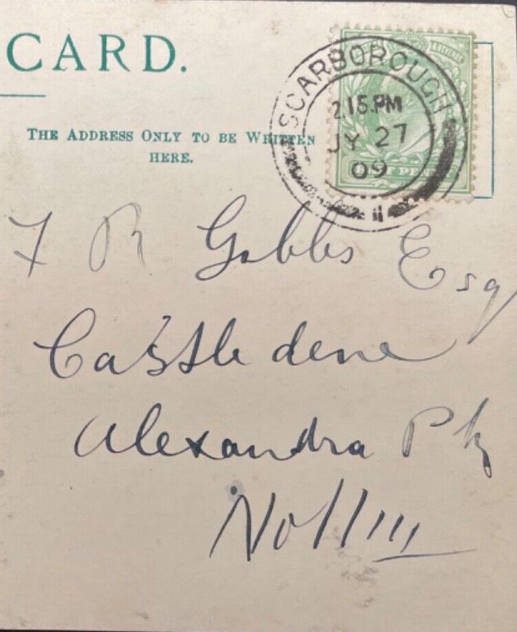 Frederick Richard Gibbs was a well know Nottingham clock and watch maker – see here. By 1911 the Gibbs Family had moved to ‘Castledene’. He and his wife a son called Frederick William, who was born in 1909, so he is not the ‘Will’ that sent the postcard.